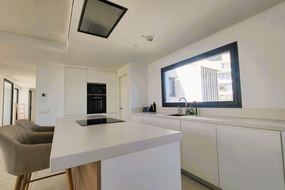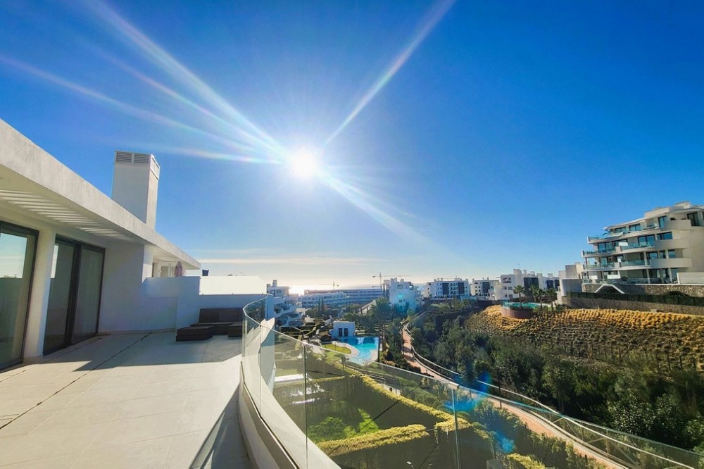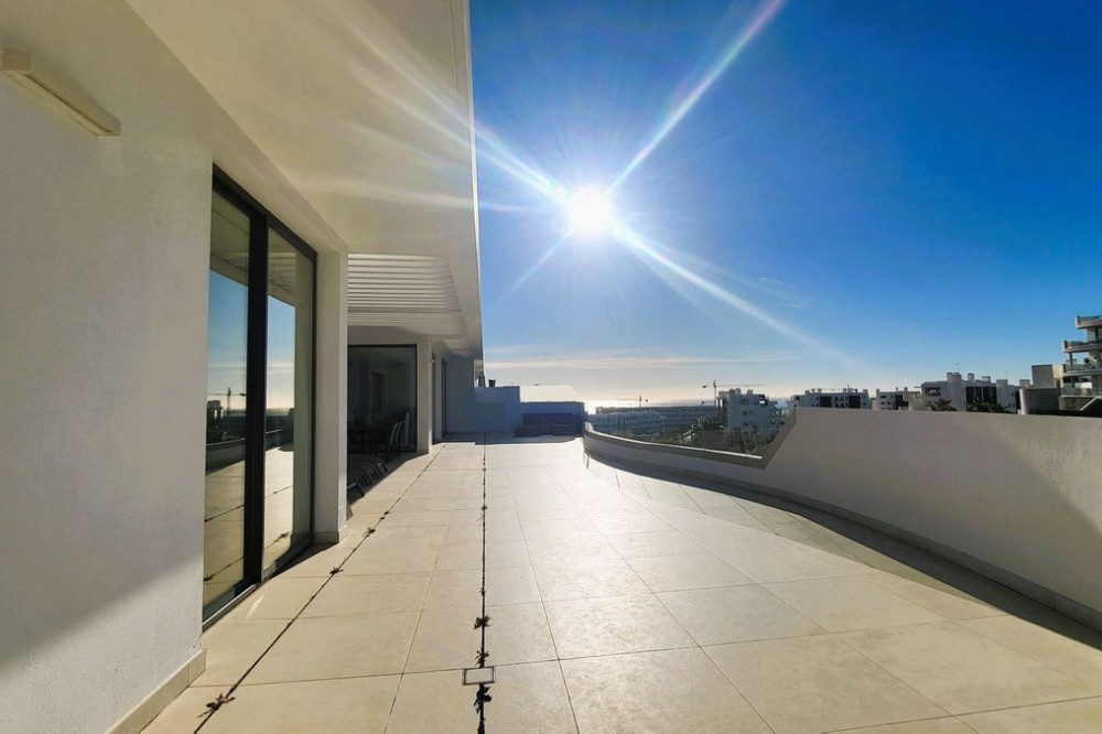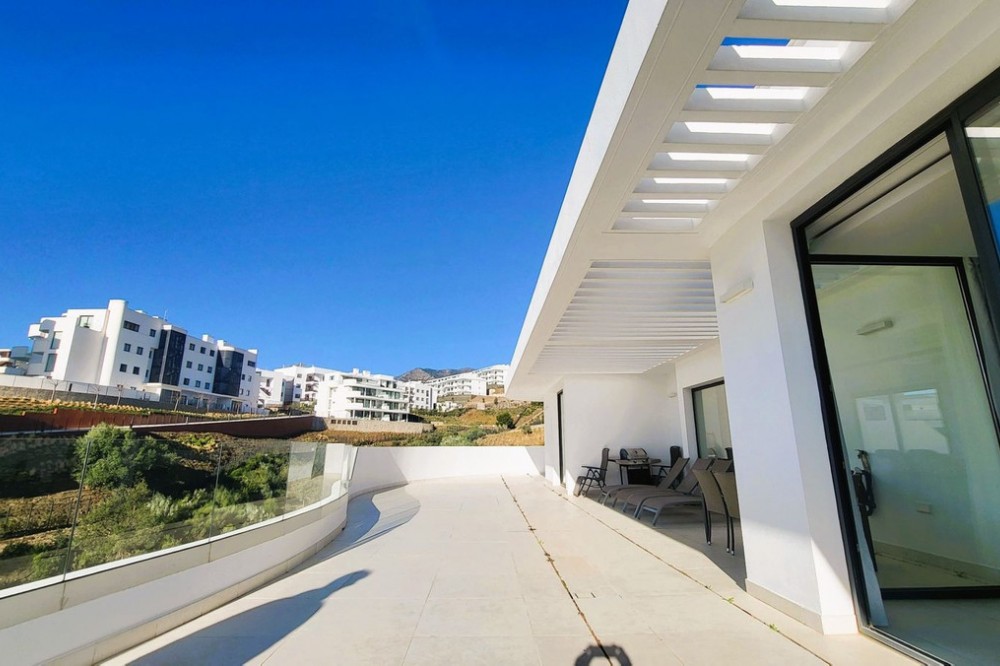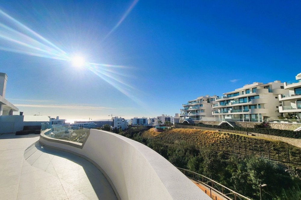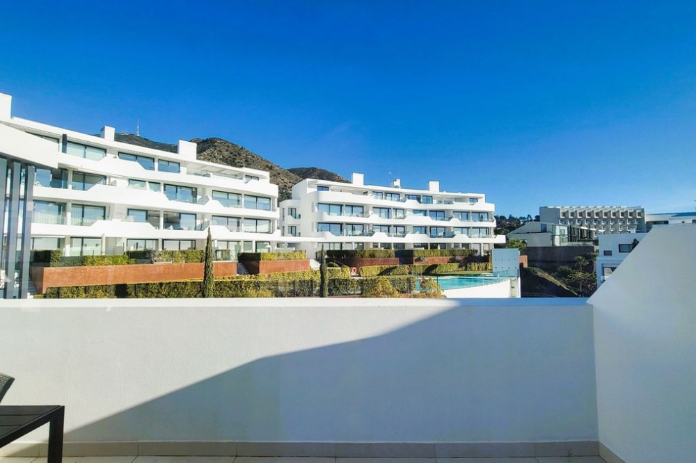 - Luxury west facing penthouse, located in the exclusive urbanization of Higuerón West. Consists of entrance, hall way, spacious living-dining room with floor to ceiling glass sliding doors leading out to a large wrap around terrace of 158m2, with views of the mountains, gardens and partial sea views. Open plan kitchen fully furnished and equipped with electrical appliances from Bosch and laundry area with washing machine/dryer. Main bedroom with ensuite bathroom and walk-in closet, 2 extra bedrooms with built-in wardrobes and guest bathroom. There is also a backside terrace of 15m2 with access from the living room. Air conditioning hot and cold by Airzone, video intercom, domotic system, pre-installation alarm system, floor heating in both bathrooms. Includes two parking spaces and one storage room.