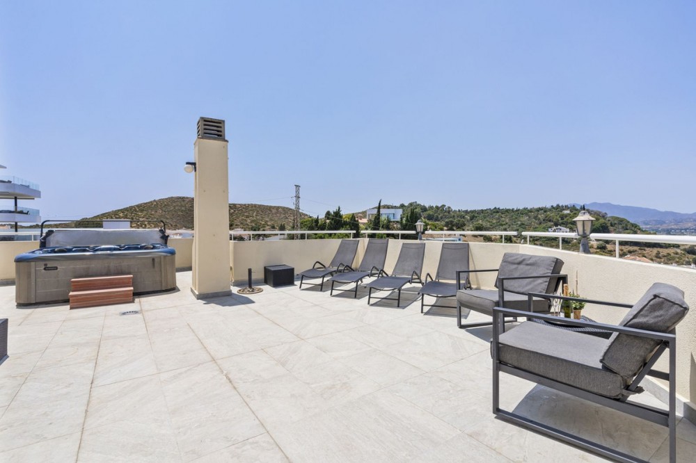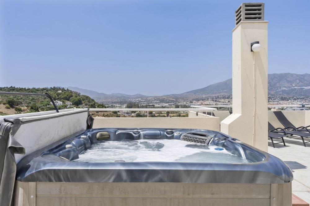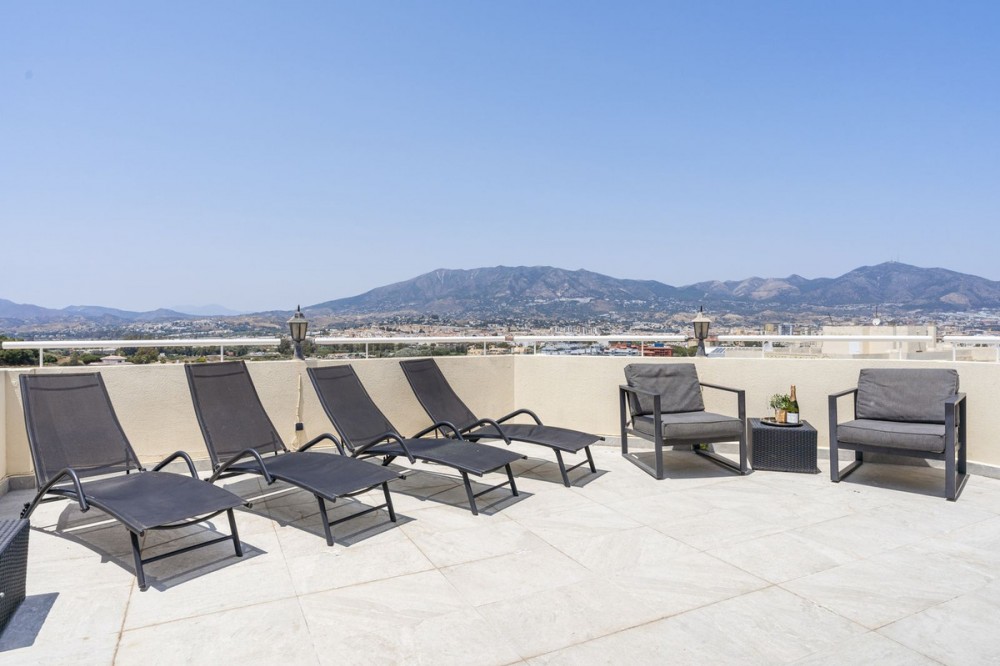 - Welcome to our large penthouse with 4 bedrooms and 125m2 terrace with Jacuzzi, located just around the corner from the Fuengirola Castle and the enormous shoppingcenter of Miramar in Fuengirola. This clean apartment features a large and fully equiped kitchen with a closed space with a washingmachine, there is a large livingroom with a spacious sofa, diningtable and a large tv and it leads out to the 460 degree terrace with panoramic views over the mountains and Fuengirola. Our place can host up to 8 persons over 4 bedrooms. There is a communal pool open during the summer months and a safe garage. The Jacuzzi will be prepared and ready for your arrival aswell the bbq for the good evenings. Bathrooms renovated winter 2023 Terrace renovated winter 2024 65.658€ in net revenue generated 2024-2025 as a vacation rental. Has tourist license and NRA number.
