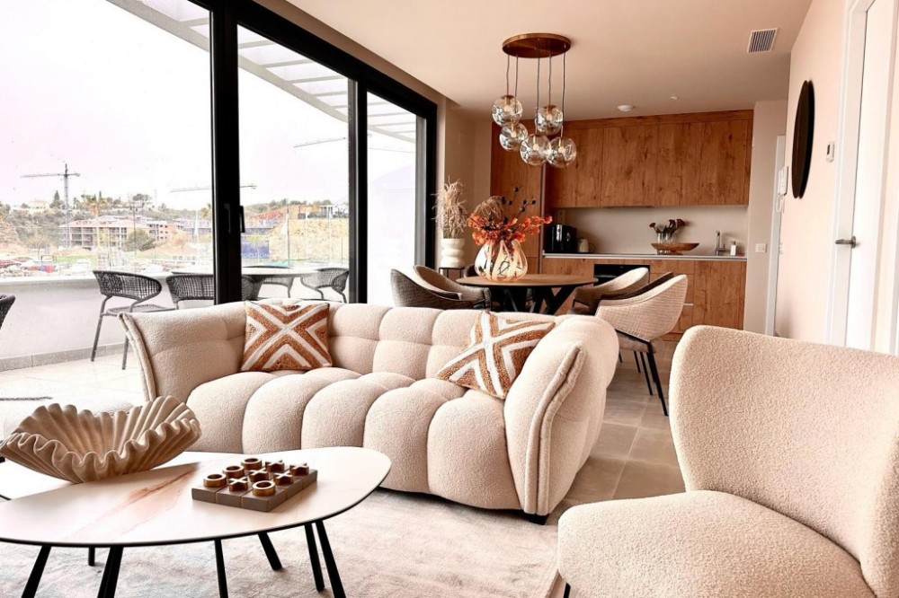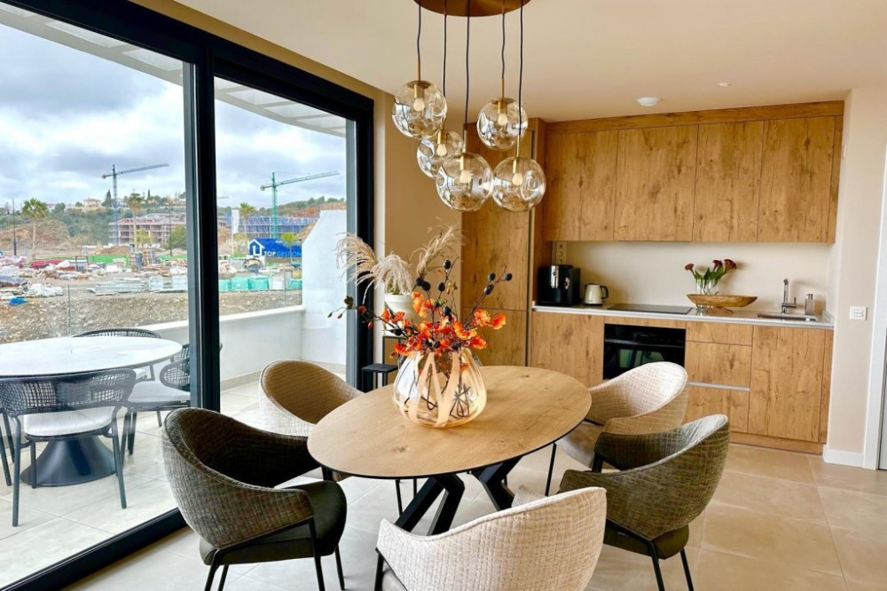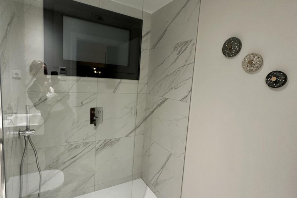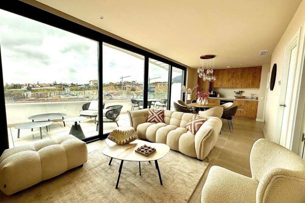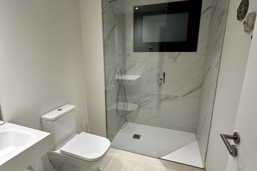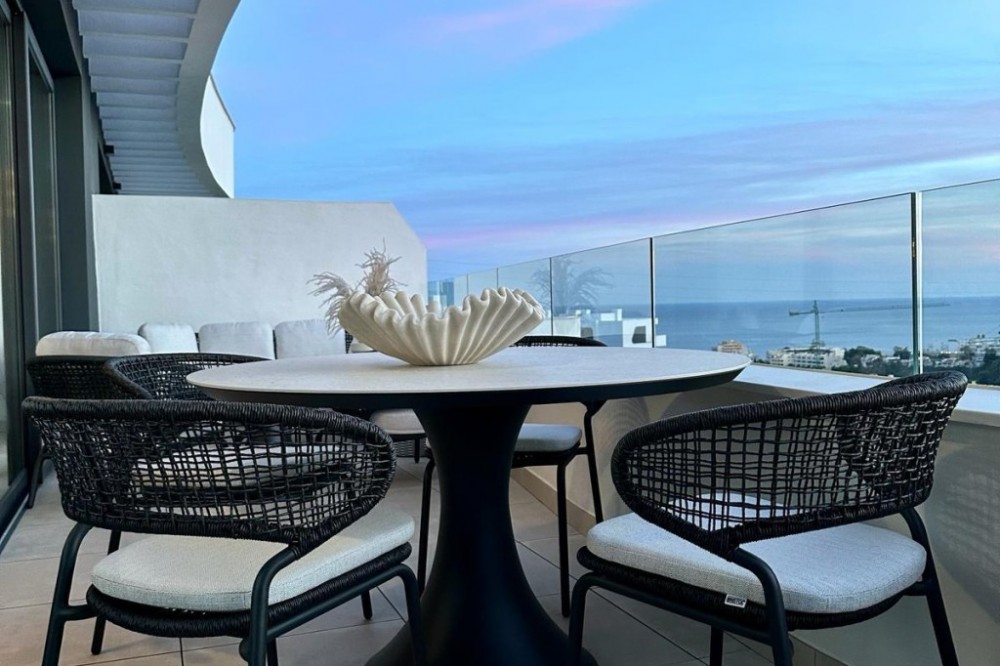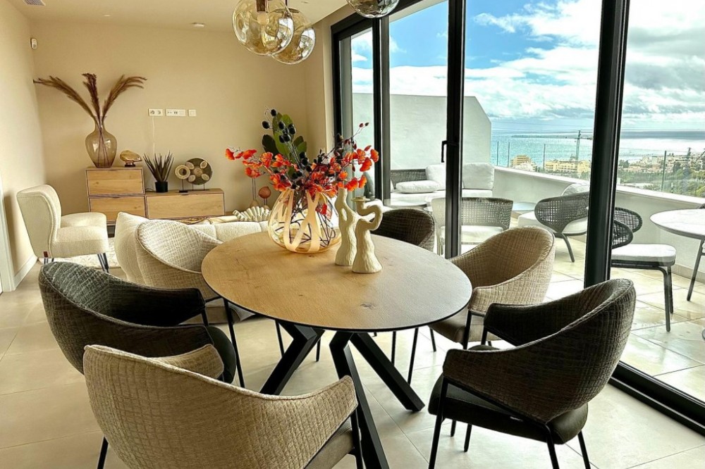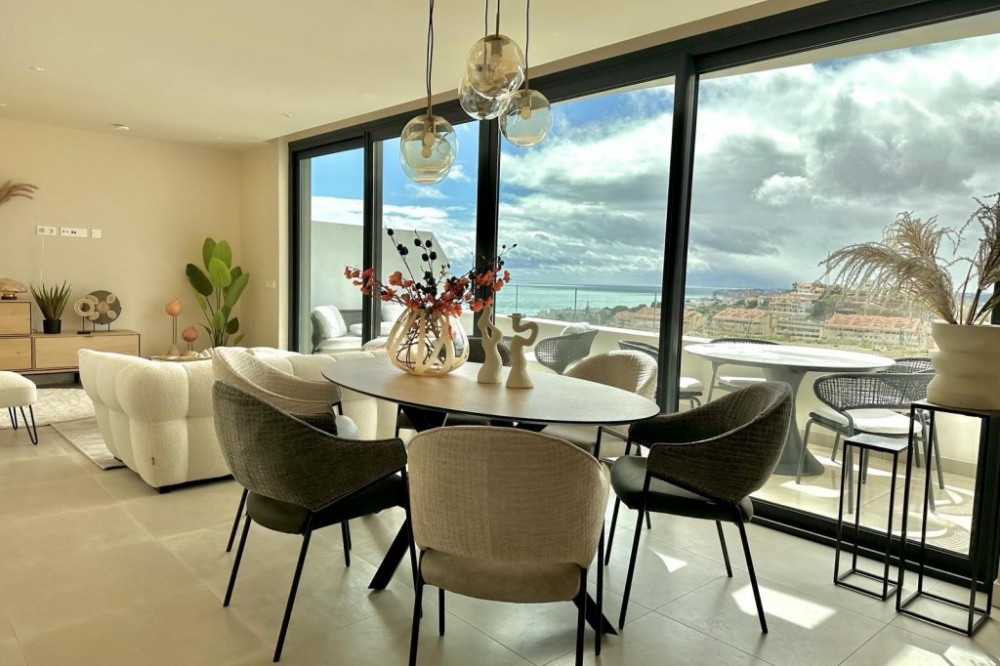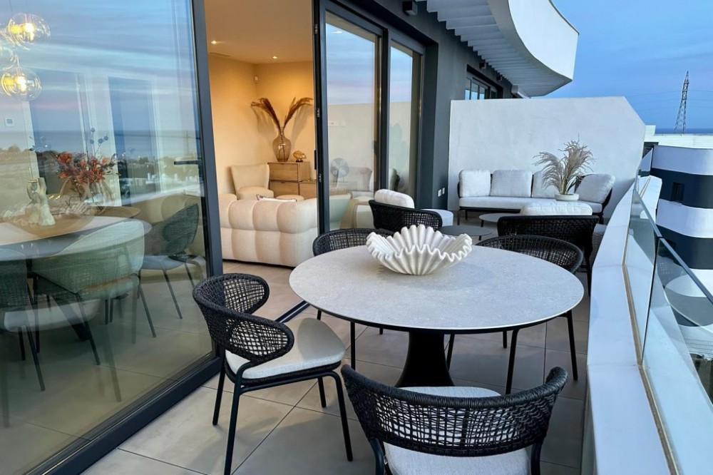 - New built modern style penthouse in El Higueron en Fuengirola with two bedrooms and one bathroom, open plan kitchen, living room and with stunning terrace with panoramic sea views, sold furnished with quality furniture and including an exterior parking space, an underground parking space and a storage room. Air conditioning hot and cold via aerothermia, electric blinds in the living room, dim switches in all rooms, tv and internet connections in the living and bedrooms, underfloor heating and special tiles and rain shower in the bathroom. Gated complex with pools and facilities. The beach is a 15 minute walk away. The community allows holiday rentals.