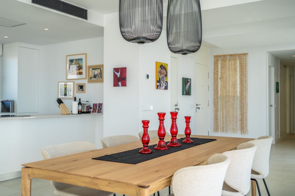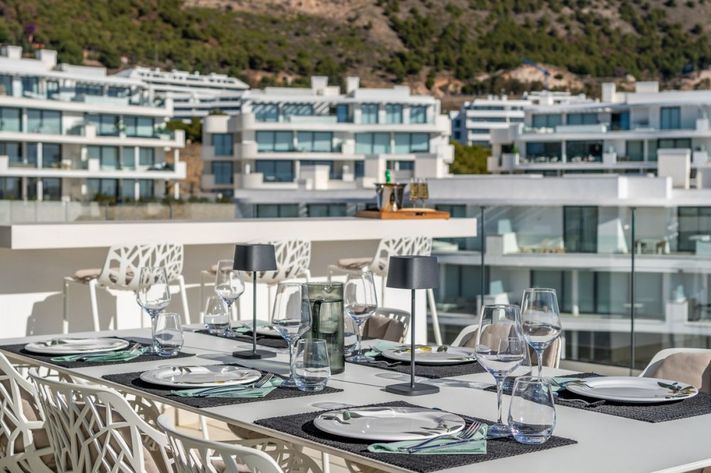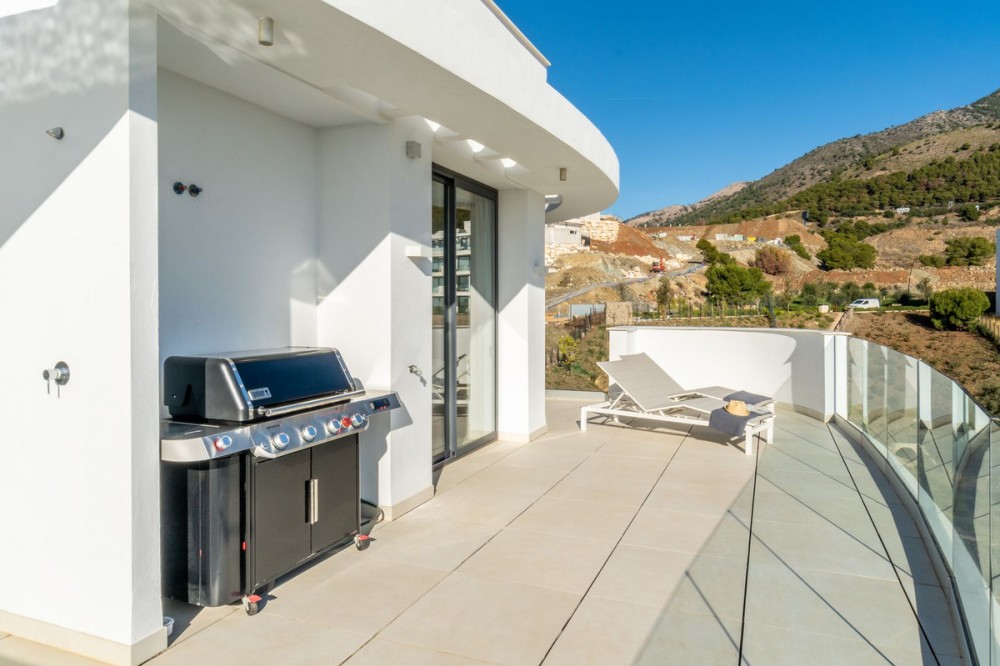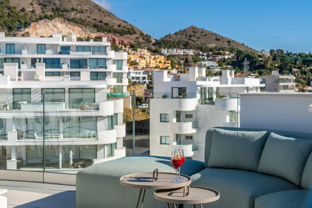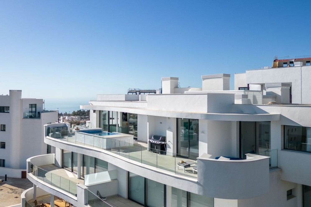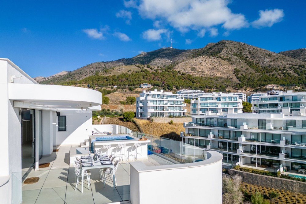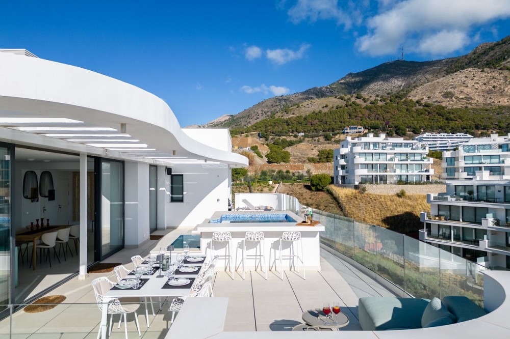 - Exclusive Luxury Penthouse with Panoramic Mediterranean Views – 269 m² Discover a truly unique gem on the Costa del Sol. This stunning 269 m² penthouse, built in 2023, perfectly combines contemporary design, elegance, and breathtaking Mediterranean views. Set within a private gated community with 24-hour security, it offers an atmosphere of privacy, exclusivity, and comfort. Occupying the entire top floor of the building and holding a tourist license, this property is an ideal investment—whether as a private residence or a profitable rental opportunity. The elegant, light-filled interior features three spacious bedrooms, including a master suite, and an additional independent bathroom. Direct access from the underground parking to the apartment ensures both comfort and security. The spacious living area with underfloor heating opens onto a spectacular private terrace—a true Mediterranean oasis. Enjoy a private pool, sun loungers, cozy sofas, an outdoor dining area, and a barbecue, all enhanced by a Sonos sound system to create the perfect ambiance. The terrace, equipped with two electric awnings, offers panoramic sea views that can be enjoyed from sunrise to sunset. The community also features two saltwater pools for residents’ use. The modern open-plan kitchen is fully equipped with a wine fridge, ice maker, osmosis water system, and high-end appliances, blending functionality and design in a bright, welcoming space—perfect for cooking and entertaining. This penthouse embodies the perfect balance between exclusivity, comfort, and investment potential. Whether as a main residence, holiday home, or rental property, its prime location, modern architecture, and tourist license make it an exceptional opportunity on the Costa del Sol. *Furniture not included in the final price.