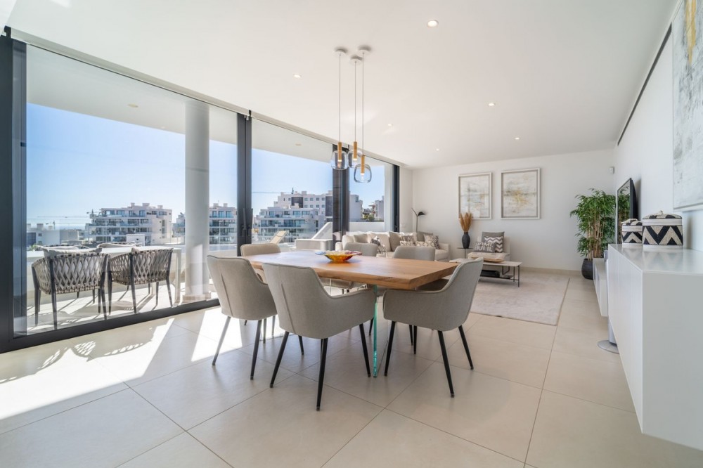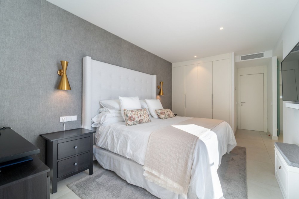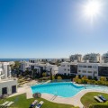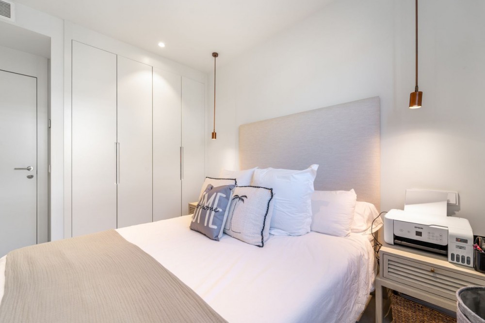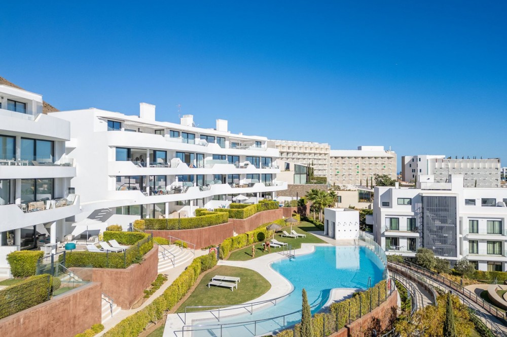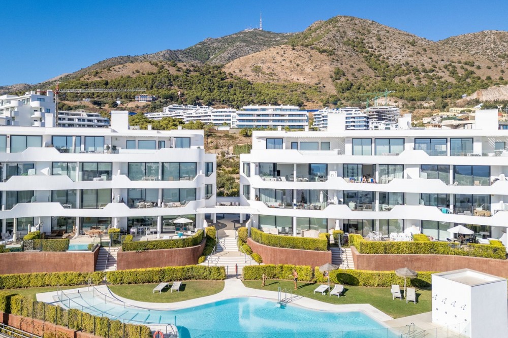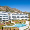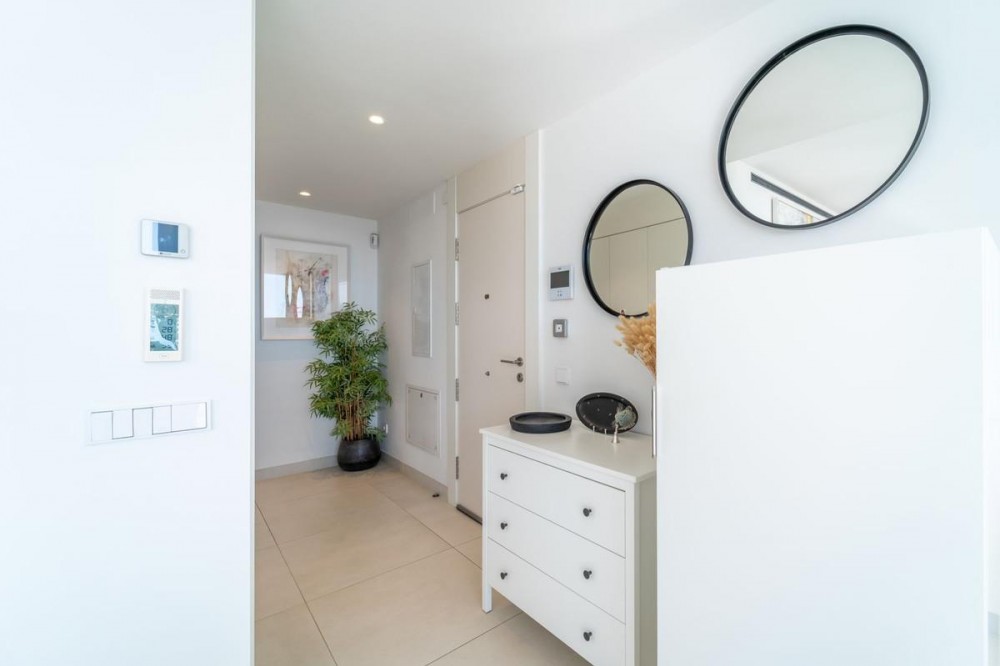 - Elegant south facing apartment, in the exclusive urbanization of Higuerón West, with 3 bedrooms, 2 bathrooms, spacious living-dining room, open plan kitchen fully furnished and equipped with electrical appliances from BOSCH, laundry area with washing machine/dryer, large terrace of 26m2 with amazing panoramic sea views. Master bedroom with closet, open plan ensuite bathroom and access to a small terrace. Air conditioning hot and cold, video intercom, domotic system, built-in wardrobes in all bedrooms and hall, pre-installation alarm system, under floor heating in bathrooms. Includes two parking spaces and one storage room.