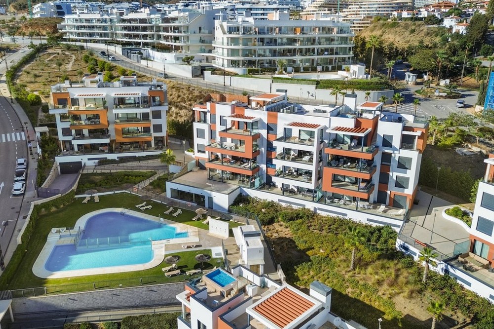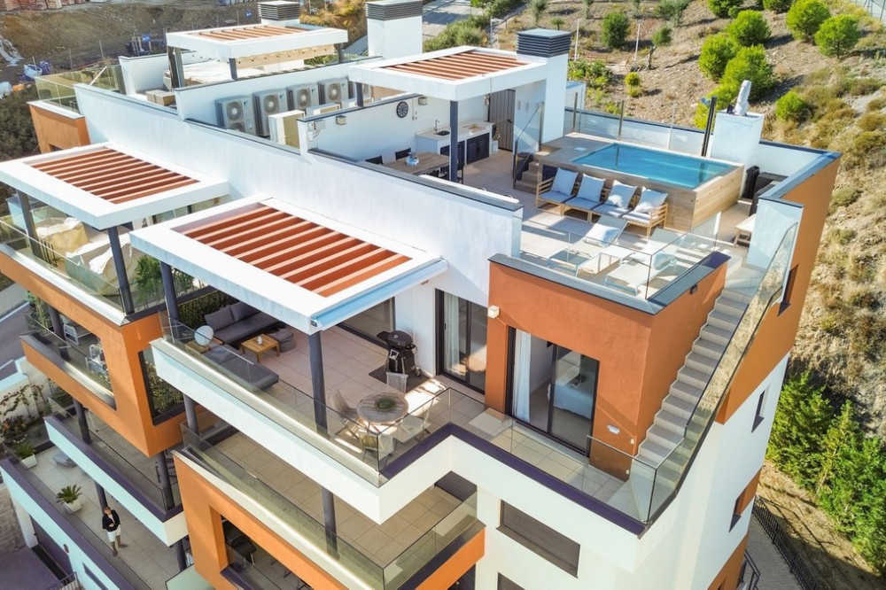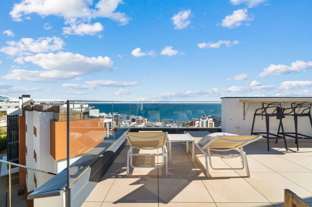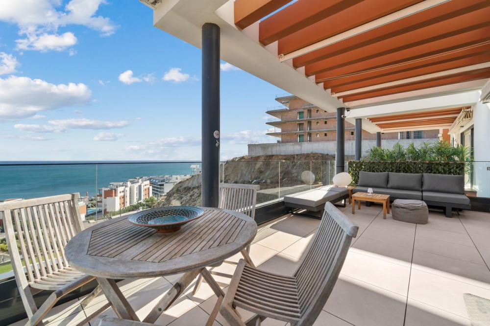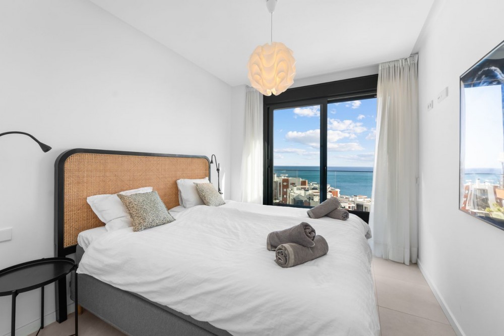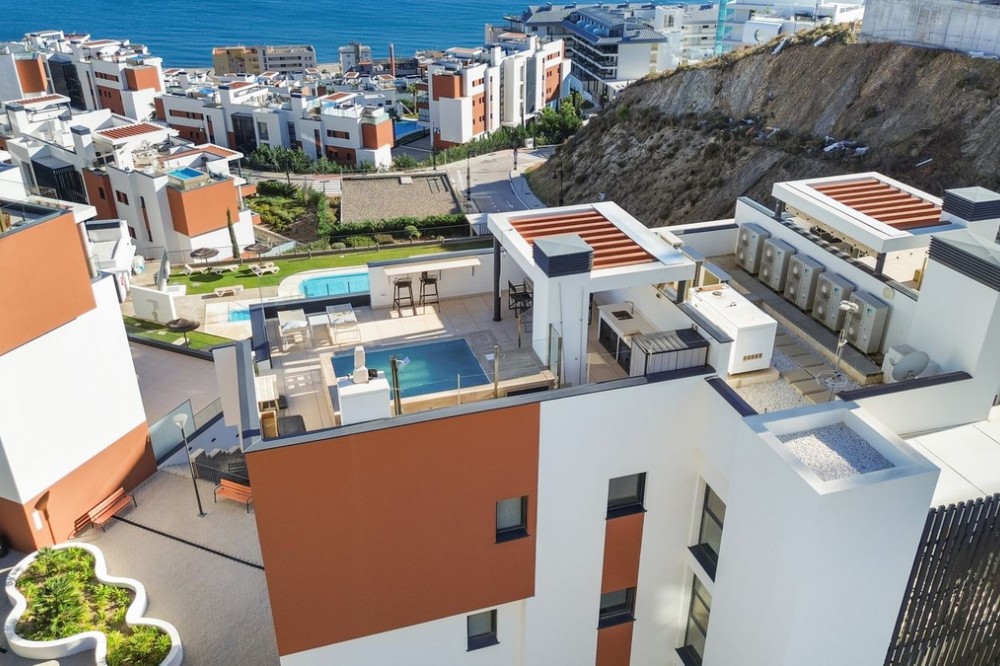 - Luxurious duplex penthouse with stunning views of the Mediterranean Sea! This spectacular two-story penthouse delivers luxury and quality with a stunning sea view from every room. When you enter this home, you immediately feel a calm and harmonious feeling of the open floor plan that seamlessly transitions into a blue sea through the large windows. The two bedrooms are well-sized and the master bedroom has an en suite bathroom. The kitchen is equipped with top-quality appliances and directly connected is a separate room with space for a washing machine and storage. From the apartment, you take the elevator directly down to the garage where two parking spaces and a large storage room are included. The large roof terrace with its own pool, jacuzzi, bar and lounge area is inviting and imagine taking your morning snack or evening drink in this environment and just enjoying the sunrise or the starry sky ... Middle views is a popular association that offers a professional gym, community areas and high-class pool areas. Within easy walking distance you will find the train station that takes you to the airport or Malaga city. The 10-mile long promenade and its restaurant selection are also within a short walk. This is the perfect home for those of you who want to invest in a place by the sea in one of the most sought-after locations on the Costa del Sol.
