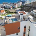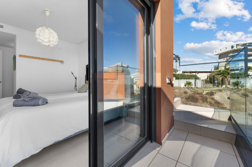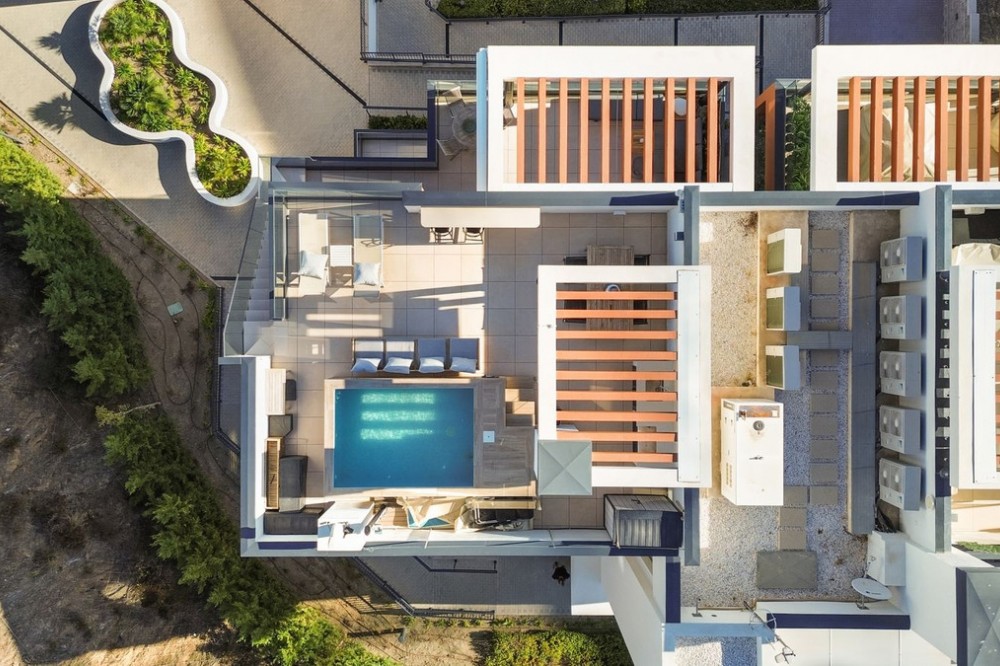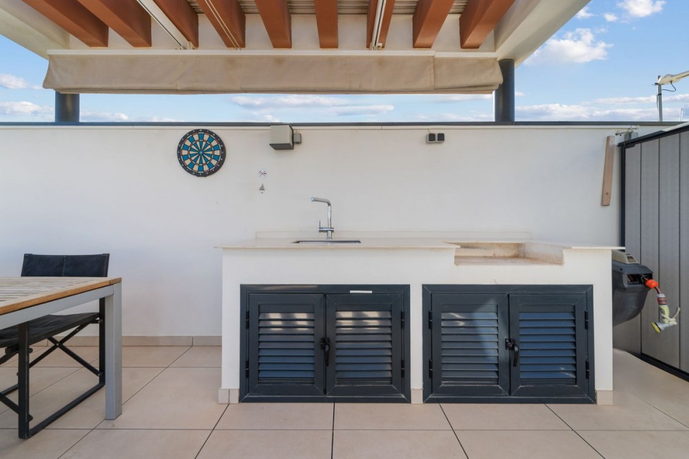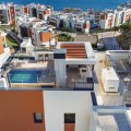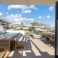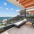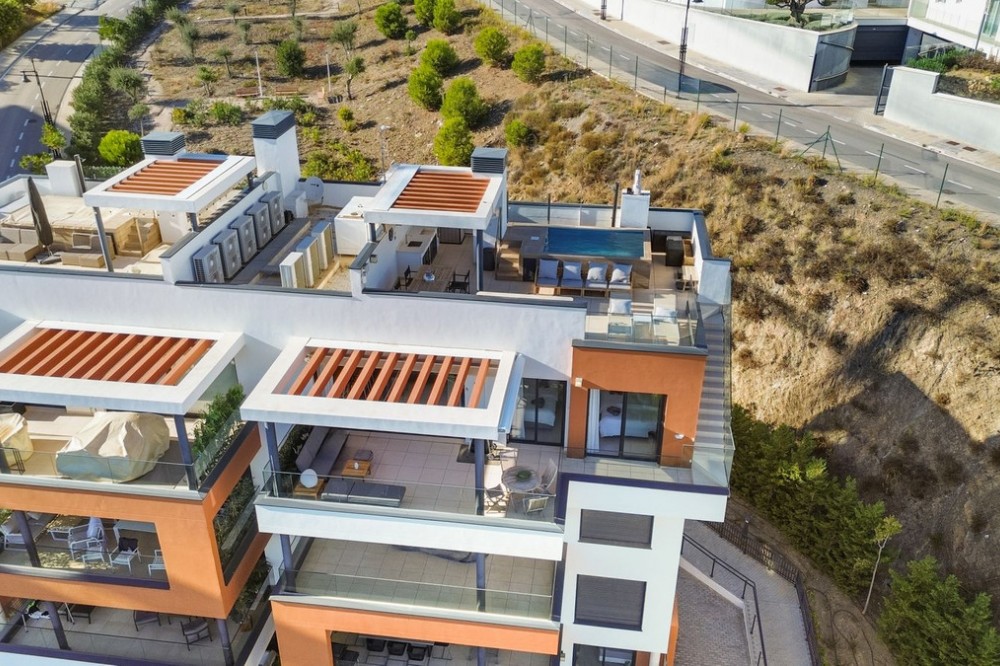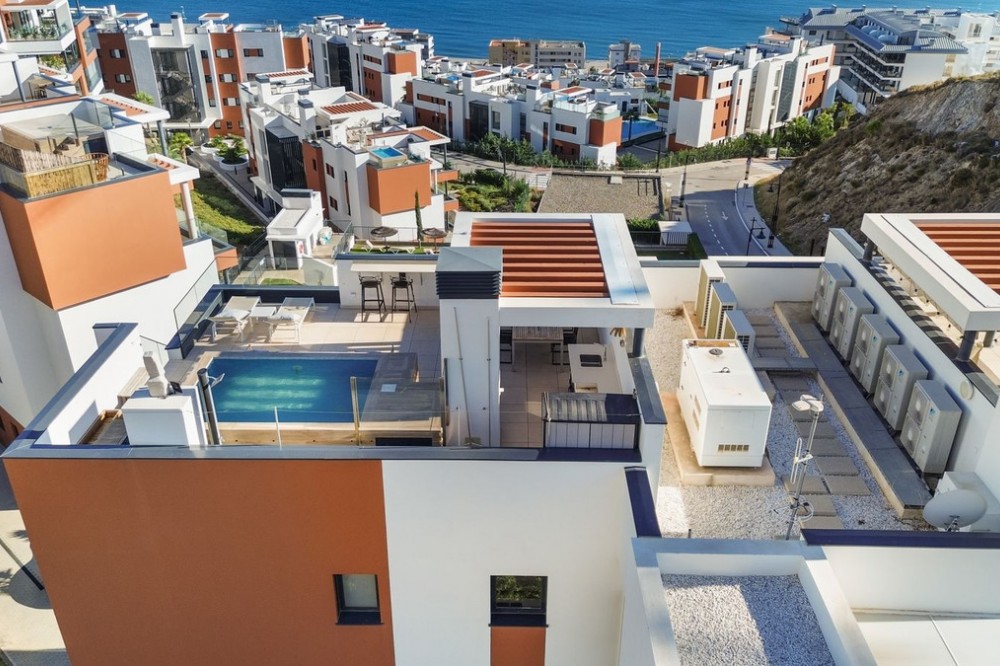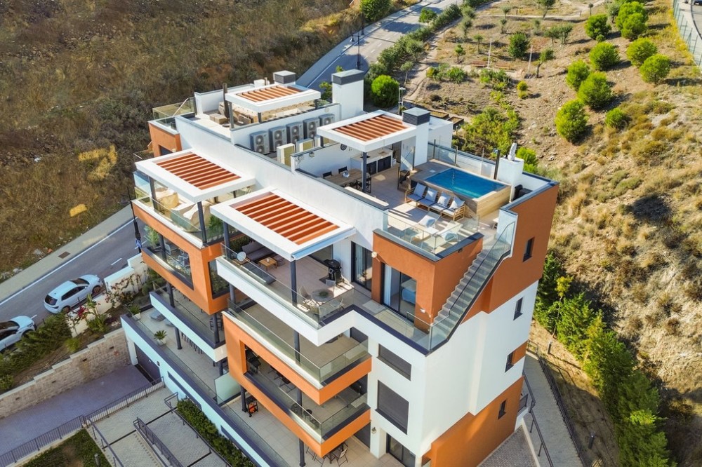 - Luxurious duplex penthouse with stunning views of the Mediterranean Sea! This spectacular two-story penthouse delivers luxury and quality with a stunning sea view from every room. When you enter this home, you immediately feel a calm and harmonious feeling of the open floor plan that seamlessly transitions into a blue sea through the large windows. The two bedrooms are well-sized and the master bedroom has an en suite bathroom. The kitchen is equipped with top-quality appliances and directly connected is a separate room with space for a washing machine and storage. From the apartment, you take the elevator directly down to the garage where two parking spaces and a large storage room are included. The large roof terrace with its own pool, jacuzzi, bar and lounge area is inviting and imagine taking your morning snack or evening drink in this environment and just enjoying the sunrise or the starry sky ... Middle views is a popular association that offers a professional gym, community areas and high-class pool areas. Within easy walking distance you will find the train station that takes you to the airport or Malaga city. The 10-mile long promenade and its restaurant selection are also within a short walk. This is the perfect home for those of you who want to invest in a place by the sea in one of the most sought-after locations on the Costa del Sol.