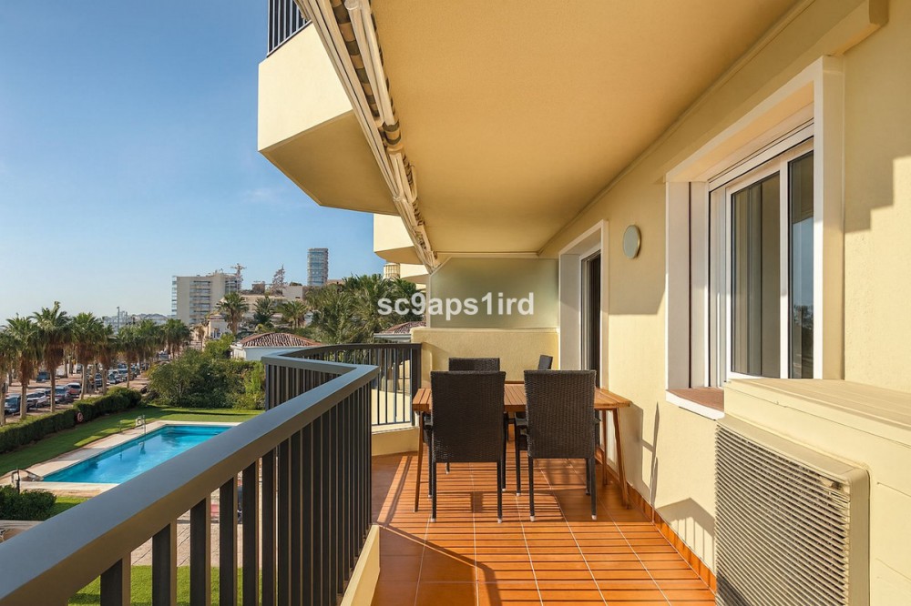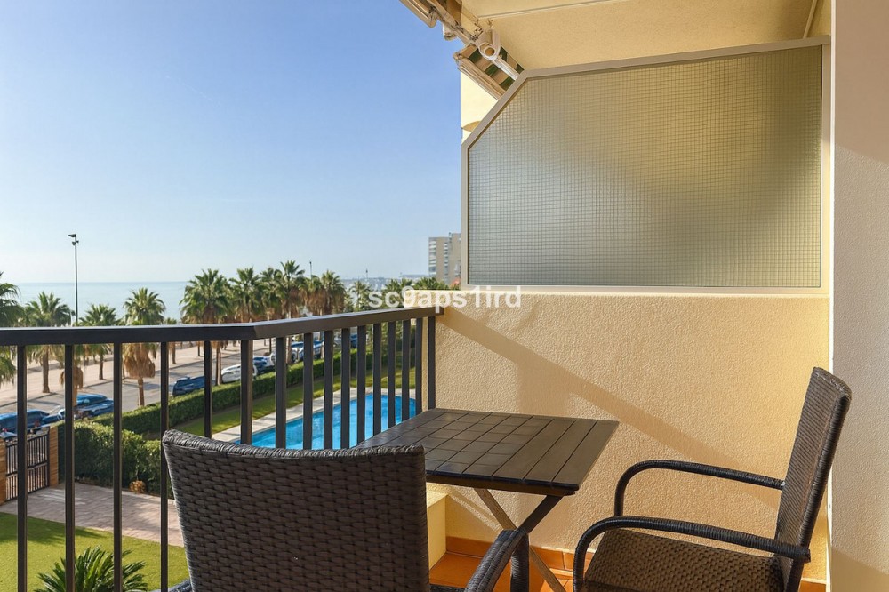 - This well-located middle-floor apartment enjoys a truly privileged frontline position on the Paseo Marítimo in Fuengirola, directly opposite the beach and just a short walk from Carvajal train station. The property offers 94 m² plus a south-facing terrace of 18 m², with open views across the Mediterranean and towards the Sierra Nevada mountains. The terrace is ideal for outdoor living and is equipped with a retractable awning for shade when desired. Inside, the apartment features three bedrooms and two bathrooms, with all bedrooms including fitted wardrobes. The layout is practical and comfortable, with a separate kitchen that includes a utility/laundry room. Built in 1980, the apartment forms part of a secure, gated residential complex offering well-maintained communal gardens, a swimming pool and communal parking. With the beach literally on the other side of the road, and walking distance to the train, shops, restaurants and everyday amenities, this property represents an excellent opportunity as a permanent residence, holiday home or investment in one of Fuengirola’s most convenient seaside locations.