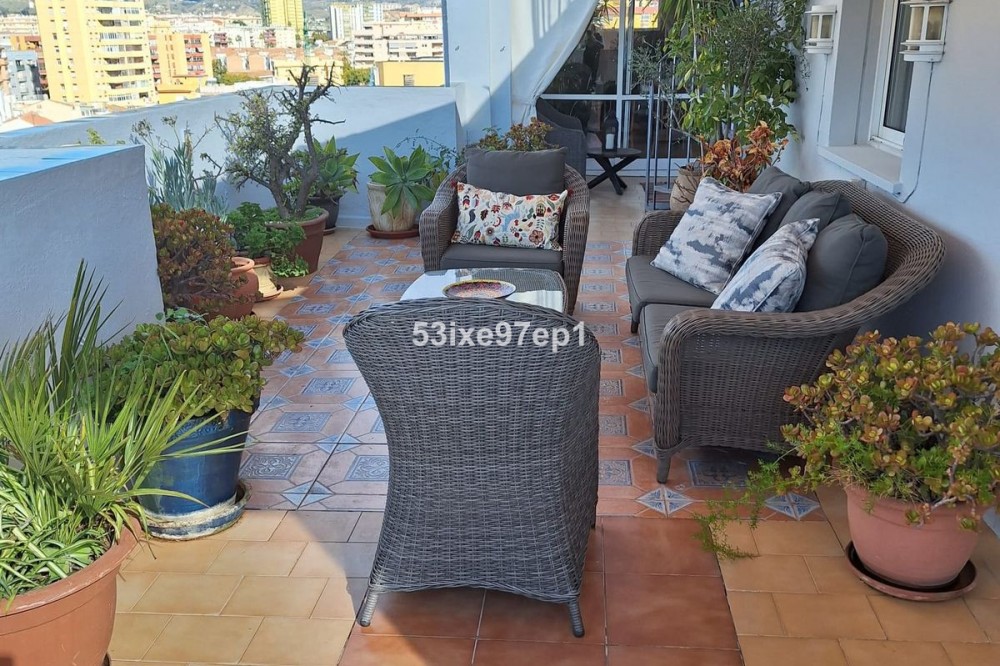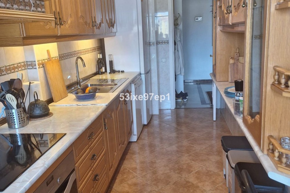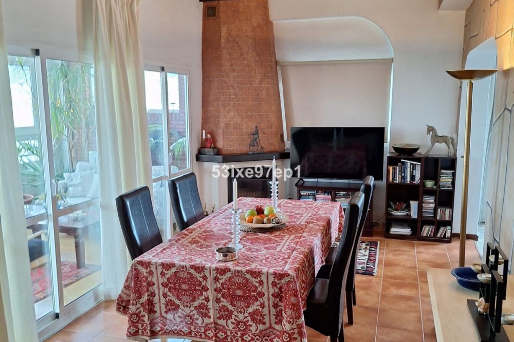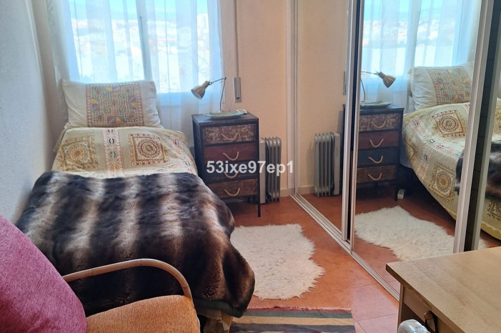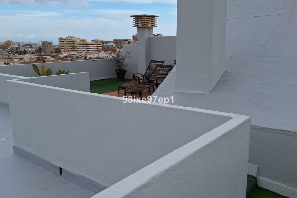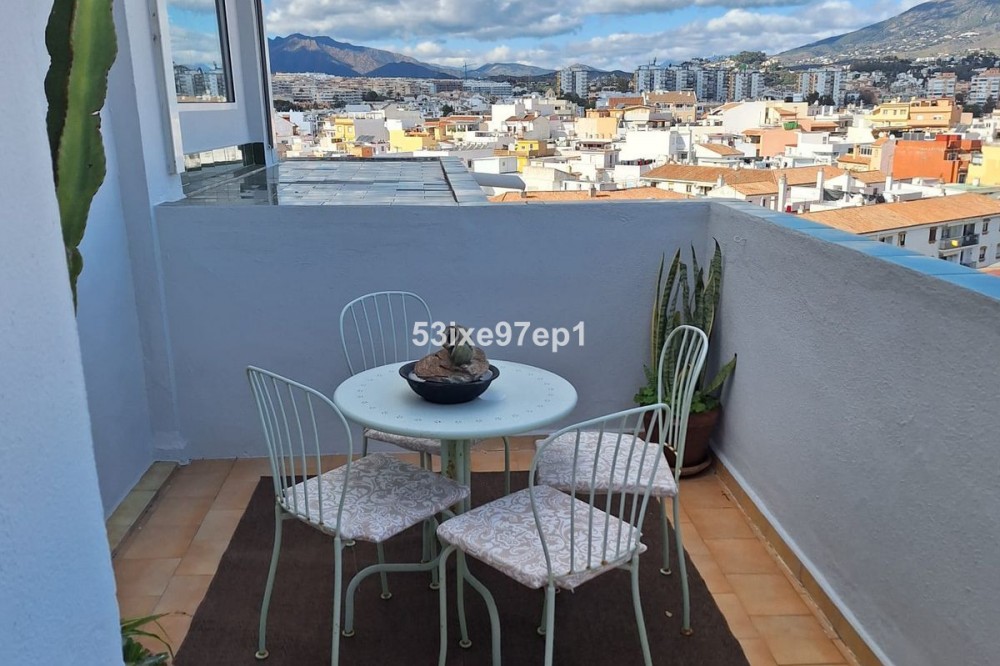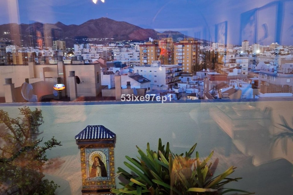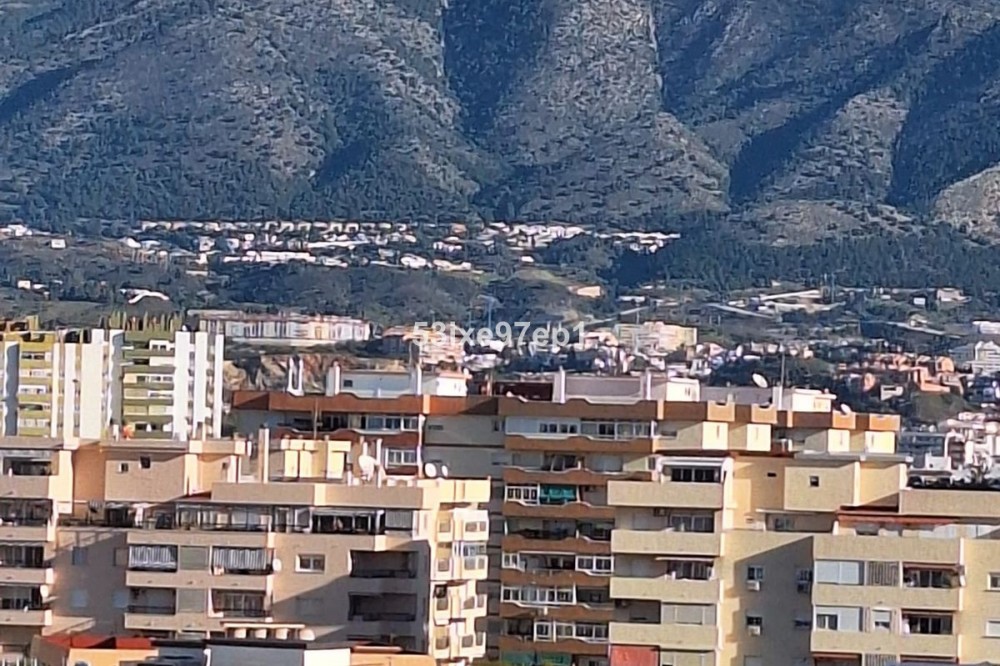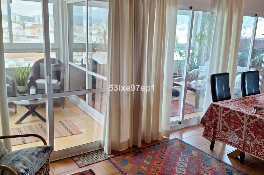 - Welcome to this fantastic and bright flagship apartment with views high above all of Fuengirola! We first enter a spacious hall and directly to the right is the kitchen with a separate area for a washing machine and extra storage. From the hall we then enter the living room with access to a terrace where you can look out over the roof ridges of Fuengirola down to the sea. Next to the living room is a spacious dining area with space for a large dining table and several chairs and an open fireplace. From the dining area we can go to another smaller living room that is glazed in. Then we come out onto the large terrace which, in addition to fantastic views of the mountains, also offers plenty of space for a seating area and lots of pots with greenery. From the hall we can also go to the left and there we find the three bedrooms, one of which has an ensuite bathroom. Two of the bedrooms have their own small terraces. Out on the terrace there is a staircase up to the roof where there is a small house that can be used as a music room, library or why not a youth room? There is also space for sun loungers here. There are also solar panels installed on the roof that heat the water in the apartment. The apartment has a private parking space in the garage. The elevator goes directly from the apartment on the 7th floor down to the garage. The property is very well maintained and the entire house has recently been repainted. It is located in a very nice Spanish neighborhood with smaller shops for meat, bread, tobacco, etc. Within a few blocks there are also a couple of larger grocery stores. It is walking distance down to the beach and the train station, which you can reach in 10-15 minutes.