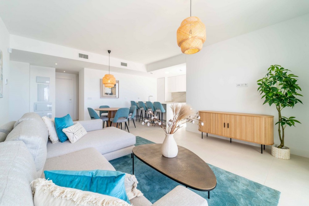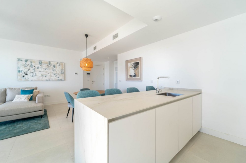 - Modern three-bedroom apartment with panoramic sea views in an elevated position on the Costa del Sol. This recently completed property offers 120 m² of interior space plus a spacious south-facing terrace, designed to maximise natural light and open Mediterranean views. The layout combines a bright living-dining area with a contemporary open kitchen and breakfast bar, creating a functional and elegant living space. The apartment features three bedrooms, two bathrooms with underfloor heating (including en-suite), and a guest toilet. High-quality finishes throughout include integrated air conditioning, electric blinds, fitted wardrobes and a separate laundry area. Private underground parking and storage room included. The gated community provides extensive facilities: outdoor pool, indoor heated pool, spa area with sauna and jacuzzi, gym, tennis and paddle courts, and 24-hour security. Strategically located between Málaga and Marbella, with Málaga International Airport just 15 minutes away and direct train access to Málaga city centre. Beaches, restaurants, shopping and international schools are all within easy reach. An excellent option as a permanent residence, holiday home or investment on the Costa del Sol.